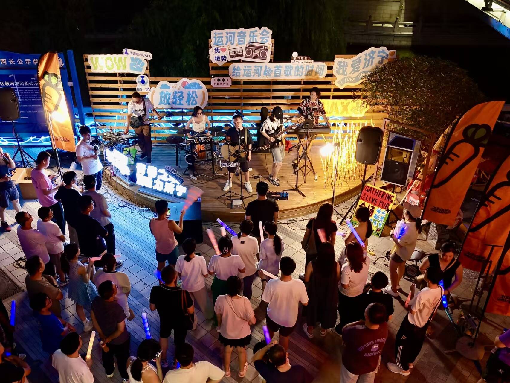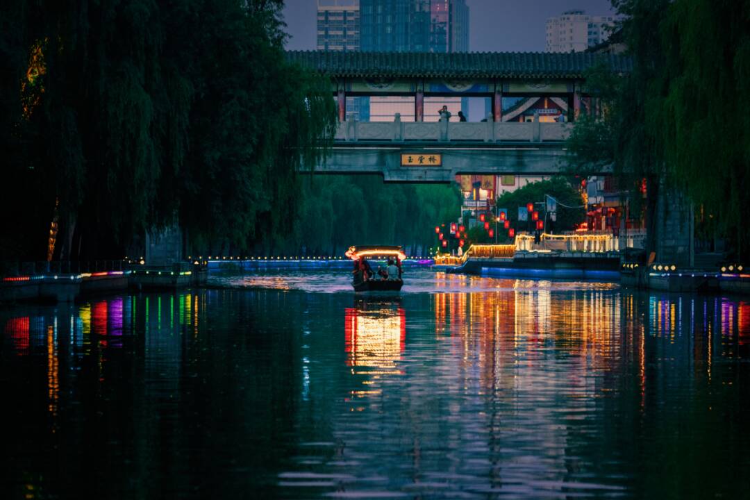 白日里,街区青石板路上行人络绎不绝,商场楼宇里人头攒动,从时尚潮牌到特色文创,从风味小吃到格调餐饮,市井烟火气十足;夜幕降临,“运河记忆”灯光秀点亮千年水道,夜市灯火通明,最妙的是乘一叶画舫泛舟河上,既能感受“江北小苏州”的韵味,也能在乔羽先生《我的祖国》旋律中,读懂流淌在运河里的家国乡愁。每逢周末或节假日,这里还会举办丰富多彩的文化活动,有运河音乐会、中医夜市、运河大集、邻里生活节、露天电影院,热闹非凡。