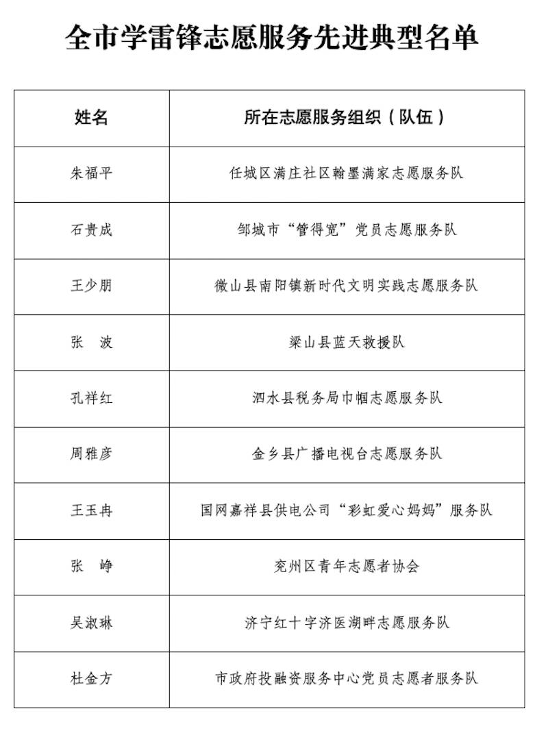 齐鲁网·闪电新闻12月1日讯 为大力弘扬志愿精神,培育志愿文化,发挥先进典型的示范引领作用,市委宣传部、市委社会工作部组织开展了全市学雷锋志愿服务先进典型宣传选树活动。经过宣传发动、择优推荐、专家评审等环节,研究确定了先进典型名单,现予以公示。